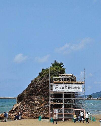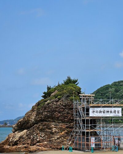 島の上にある沖御前(おきのごぜん)神社の遷宮準備のため、足場が組まれていました
