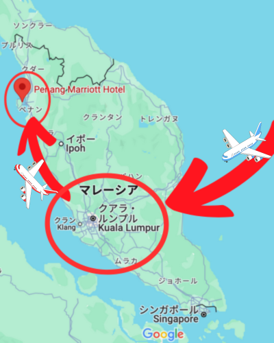 ペナン島→クアラルンプールへの国内線ルートを図でまとめました。