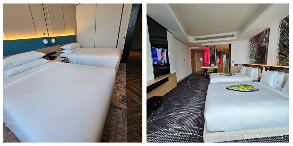 ペナンマリオットホテル(左)と Wクアラルンプールホテル(右)の客室の様子です。