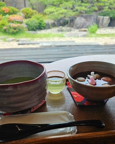 趣のある外観と庭園を眺めながら、館内のカフェで抹茶と出雲ぜんざいをいただきました。
